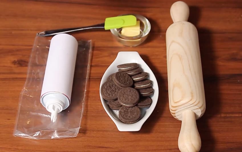 Galletas de chocolate, bolsa plástica, mantequilla, crema batida, recipiente, rodillo y tenedor.
