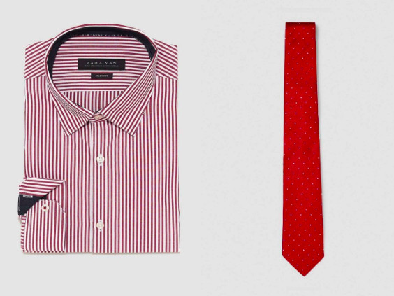 Apostar por el contraste siempre te anotará un triunfo, por ello, líneas y puntos se conjugan en los looks más dinámicos bajo el sol. Camisa a rayas de color rojo y corbata de puntos.