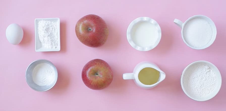 Huevo, azúcar pulverizada, manzanas, leche, azúcar, harina y aceite.