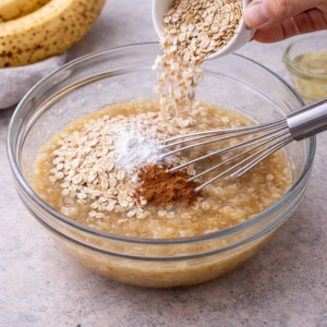 - Agrega la avena, polvo de hornear y canela