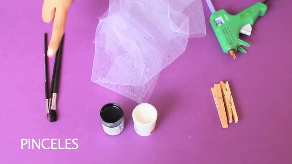 Ganchos para ropa, pintura o témpera, pinceles, velo, pegamento en barra