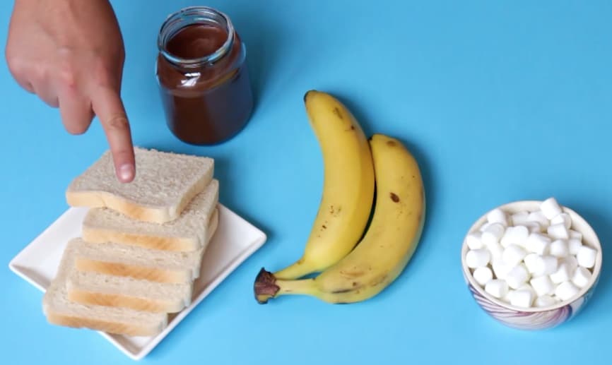 Pan tostado, bananos, nutella y marshmallows miniatura.