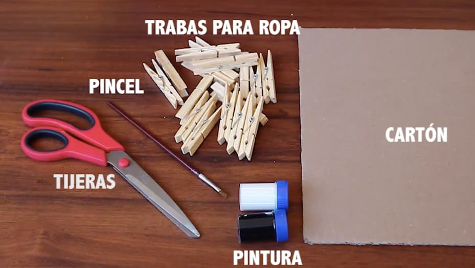 Ganchos para ropa o trabas de madera, pintura blanca, pintura negra, pincel, pegamento, cartón.