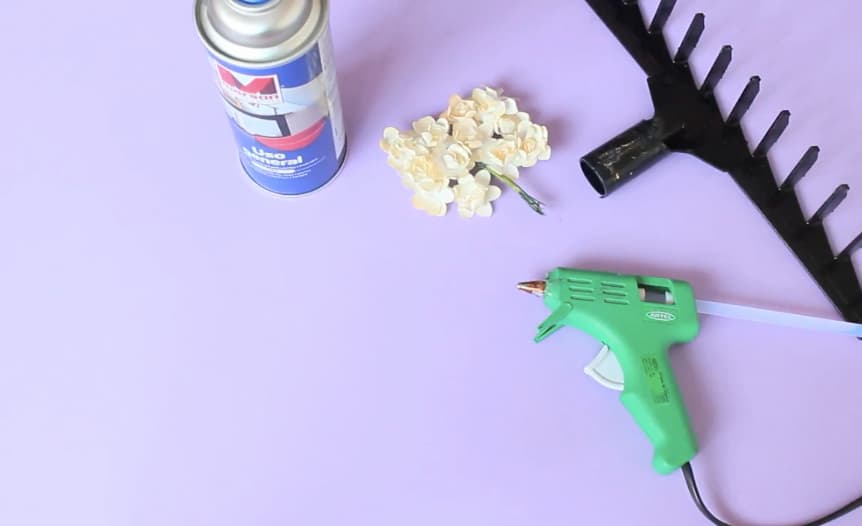Crea un estiloso porta collares 1208 Materiales: 1 rastrillo, pegamento en barra, flores y pintura en spray Pasos: 1. Pintamos el rastrillo con nuestro color favorito y dejamos secar 2. Pegamos las flores a la manga 3. ¡Ya está listo para que colguemos nuestros collares favoritos!