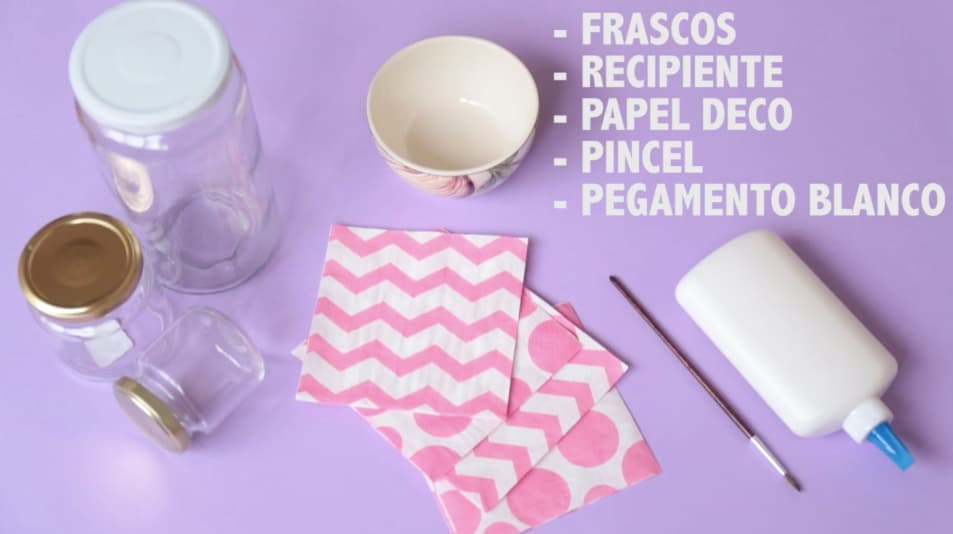 Pegamento blanco, agua, servilleta deco, pincel y frascos con tapa.