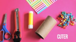 Tubo de papel higiénico, papel de color, tachuelas para pizarra, tijeras, cuchilla y pegamento.