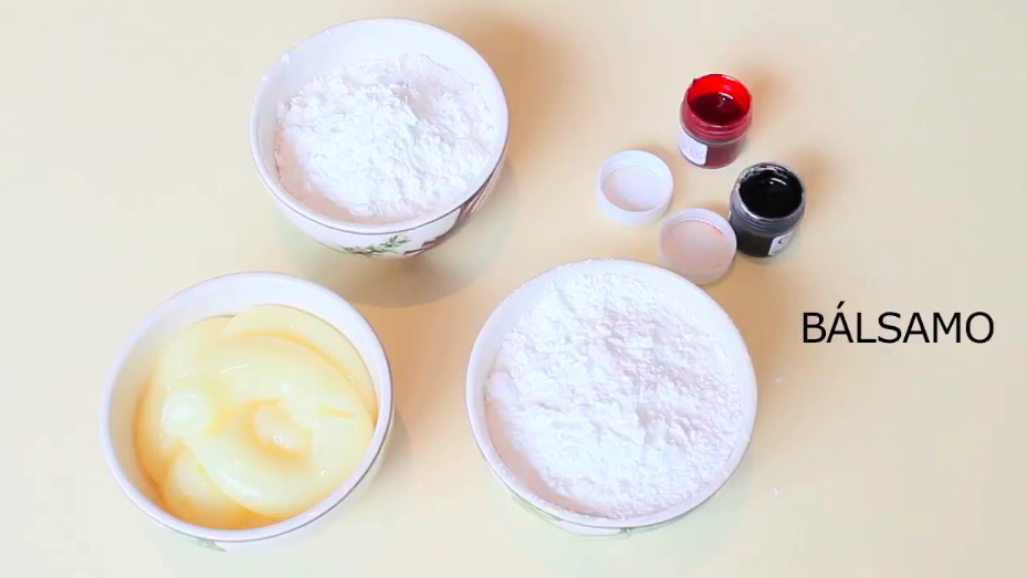 Crema acondicionadora para cabello, maicena (fécula de maíz) y colorantes vegetales.