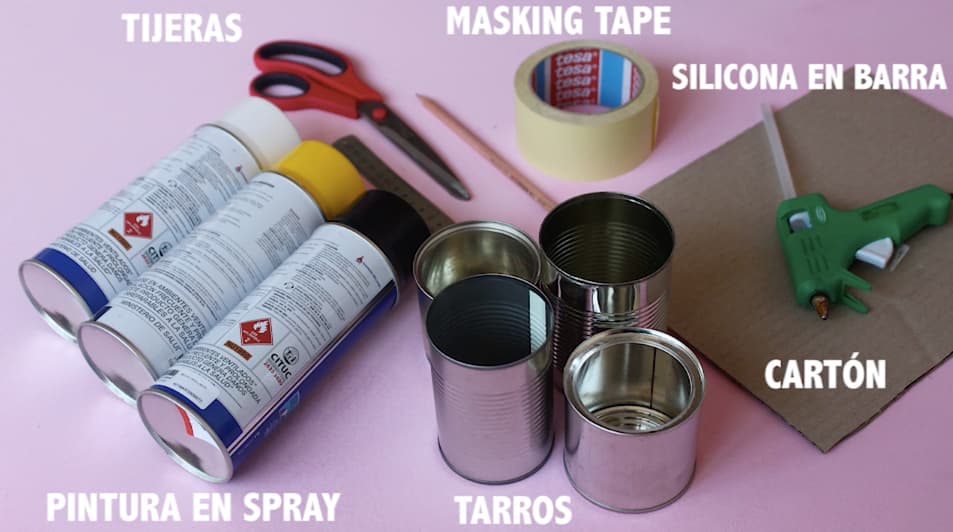 4 tarros o latas, spray de dos colores a elección, masking tape, 1 trozo de cartón o madera y pegamento de silicón.