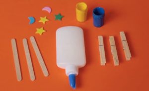 Palos de paletas, ganchos de ropa, pintura o témpera, pinceles y figuras decorativas.