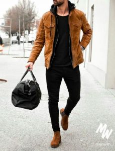 ¿Buscas un outfit distinto? Entonces este es el look para ti. Escoge una chaqueta de gamuza, unos skinny jeans oscuros, una polera oscura y combina este outfit con unas botas chelsea de color marrón.