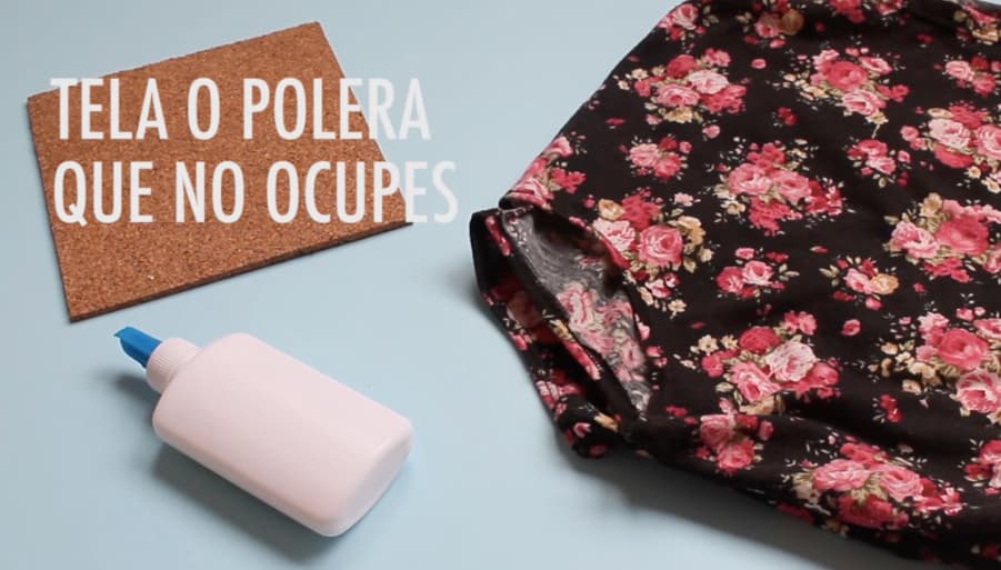 Goma blanca, plantilla de corcho y pedazo de tela.