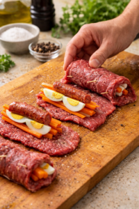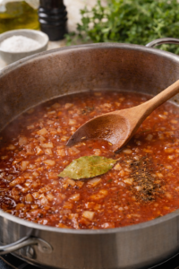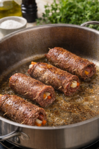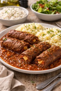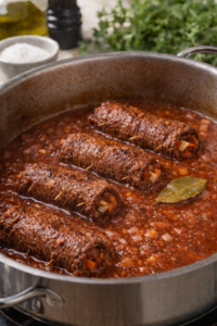 Vuelve a incorporar los rollos a la olla. Cocina a fuego bajo durante 40–60 minutos, hasta que la carne esté blanda y la salsa espesa.