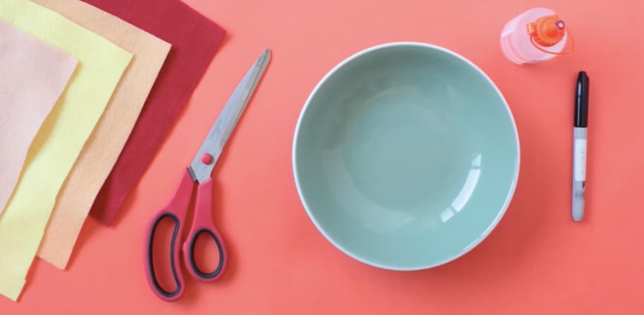 Telas de fieltro color rojo, amarillo y beige, molde redondo grande, molde redondo pequeño, tijeras, pegamento, marcador y regla.