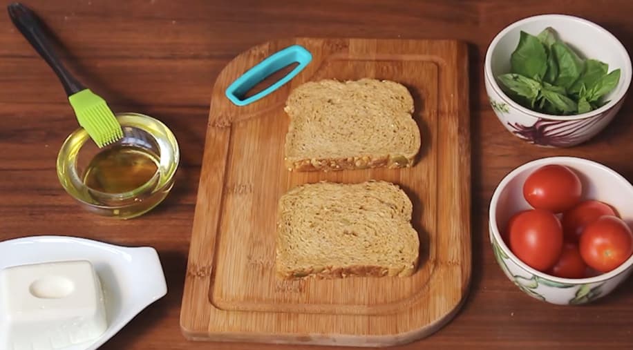 Pan integral, tomate, albahaca, queso fresco, aceite de oliva, pincel de cocina