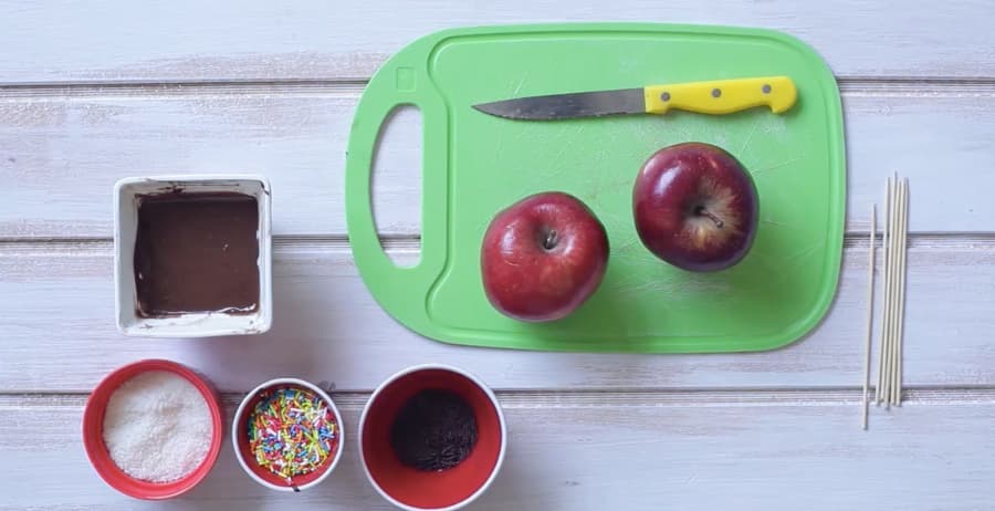 manzanas, pinchos o brochetas, chocolate derretido, decoración