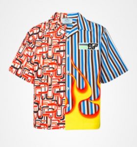 La camisa pertenece a la colección Primavera/Verano 2019 de Prada, famosa casa de modas que se ha destacado por vestir a cientos de famosos en las alfombras rojas más famosas. La prenda mezcla varios conceptos: llamaradas de fuego, lineas rectas y un estampado que parece sacado de los años 70.