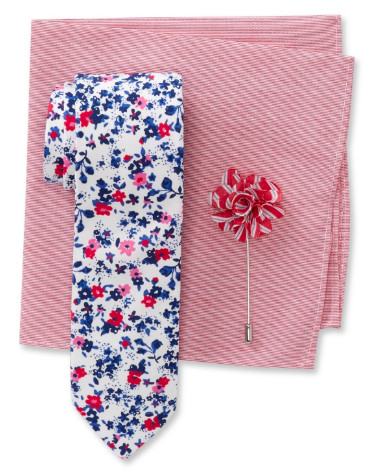 Armonía entre color y estampado sólo se logra con una combinación exacta, como en este trio con corbata, pañuelo y pin, perfecto para un look fresco en días soleados.