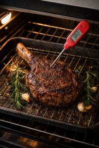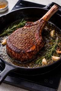 Sella el tomahawk por ambos lados (3–4 minutos por lado) hasta que esté dorado.